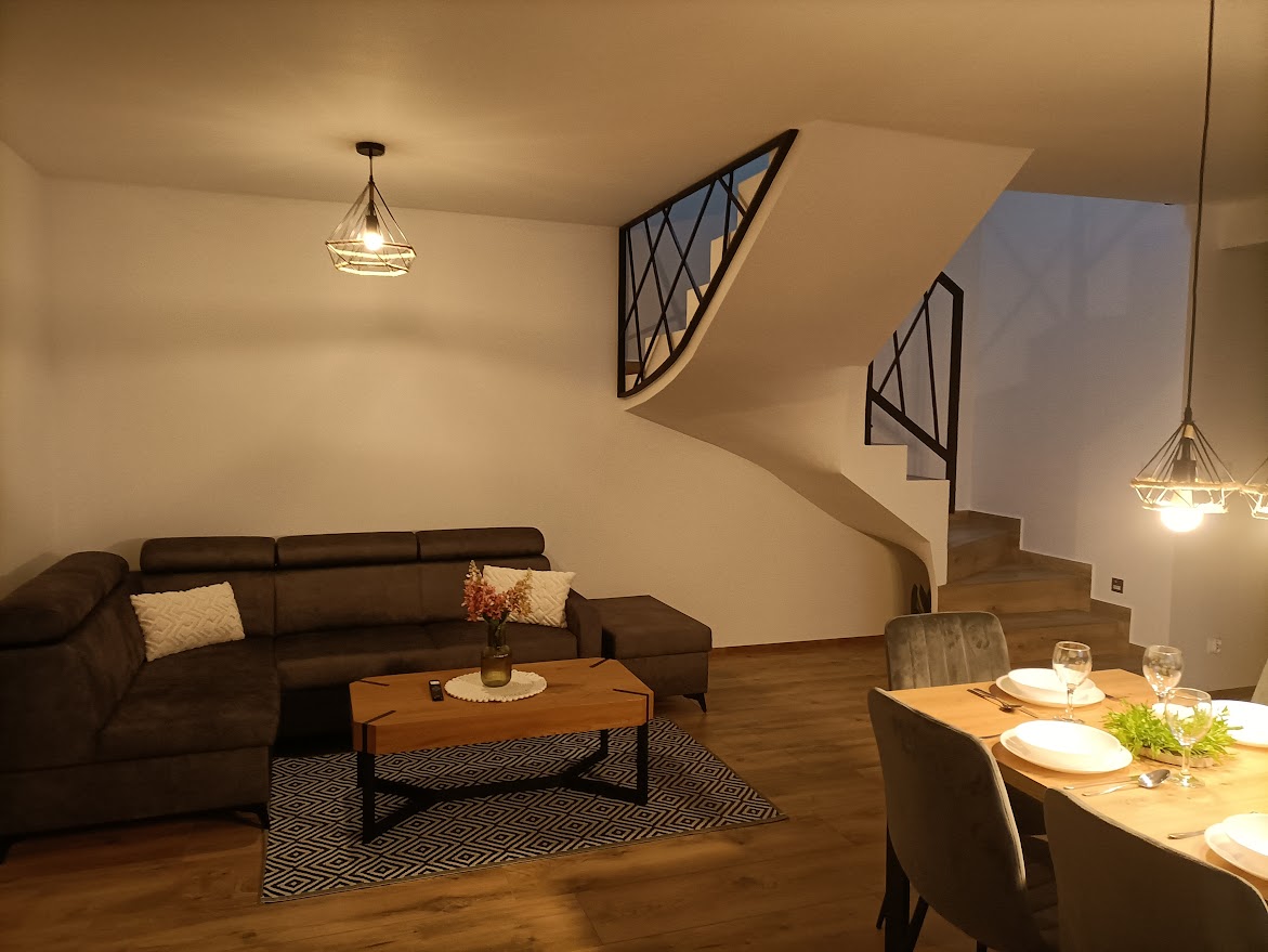 Obiekt mieści od 6 do 8 osób. Sześć osób pomieszczą pokoje na poddaszu i dwie osoby w salonie na kanapie. Jest możliwośc dostawienia łóżeczka dla dziecka. Parter posiada w pełni wyposażony aneks kuchenny (płyta indukcyjna, mikrofalówka, toster, opiekacz, zmywarka, lodówka z zamrażalnikiem, ekspres do kawy, talerze, garnki, sztućce, kieliszki, szklanki oraz kubki) z jadalnią, część gościnną z TV oraz łazienkę. Na poddaszu znajdują się trzy sypialnie oraz toaleta. W każdej sypialni są łóżka dwuosobowe. Dostęp do internetu WiFI. Każdy pokój jest wyposażony w łóżko, szafkę koło łóżka, lampkę nocną. Pokoje na górze mają wspólną łazienkę.