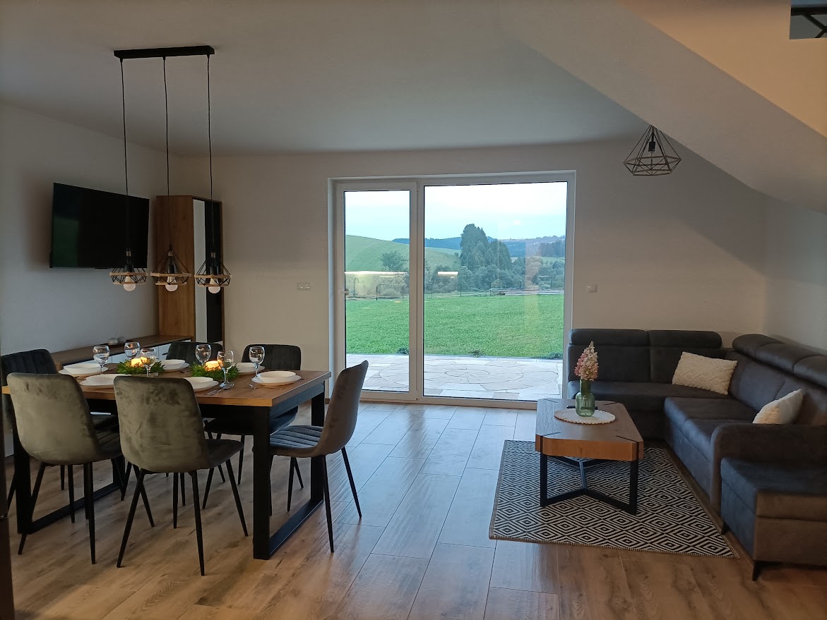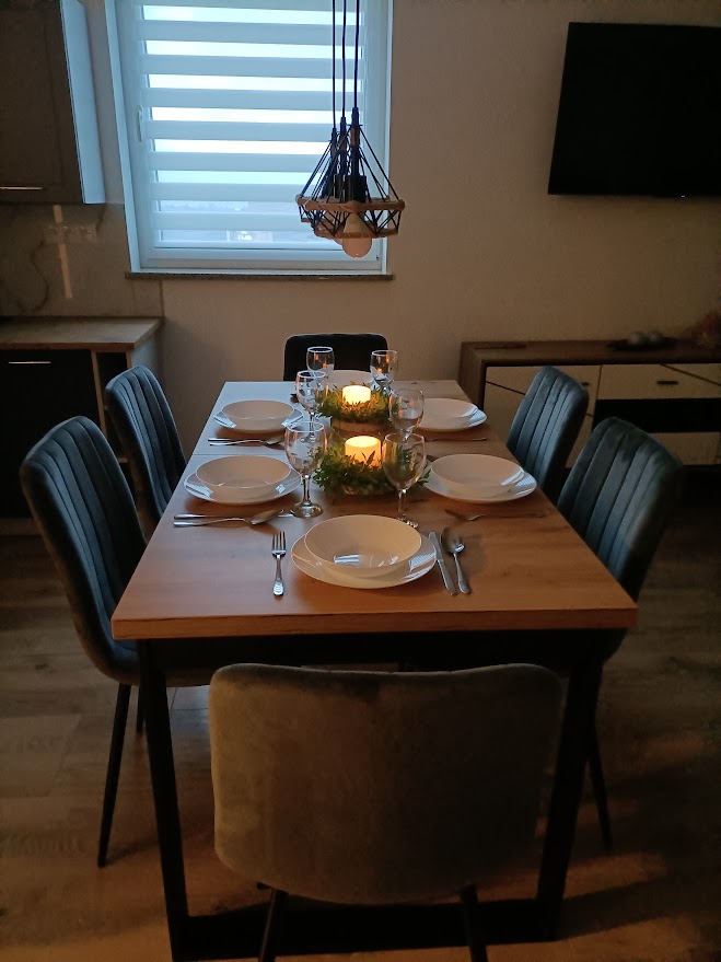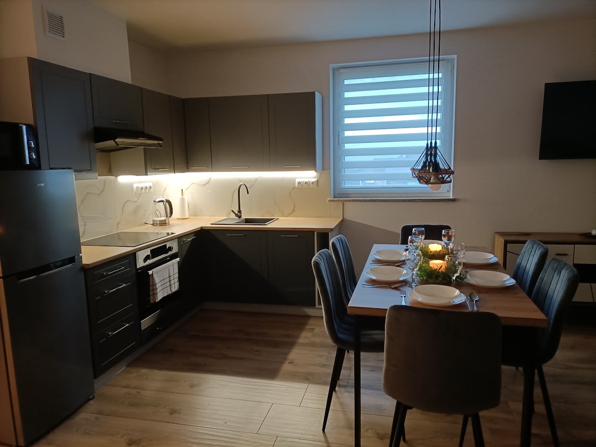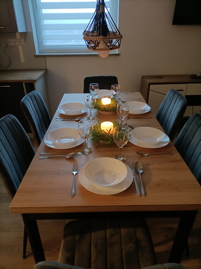 Nasz obiekt jest wyposażony w kuchnie z jadalnią, na zewnątrz dostępny jest plac zabaw z domkiem dla dzieci, zjeżdzalnią oraz hustawką, taras oraz grill.