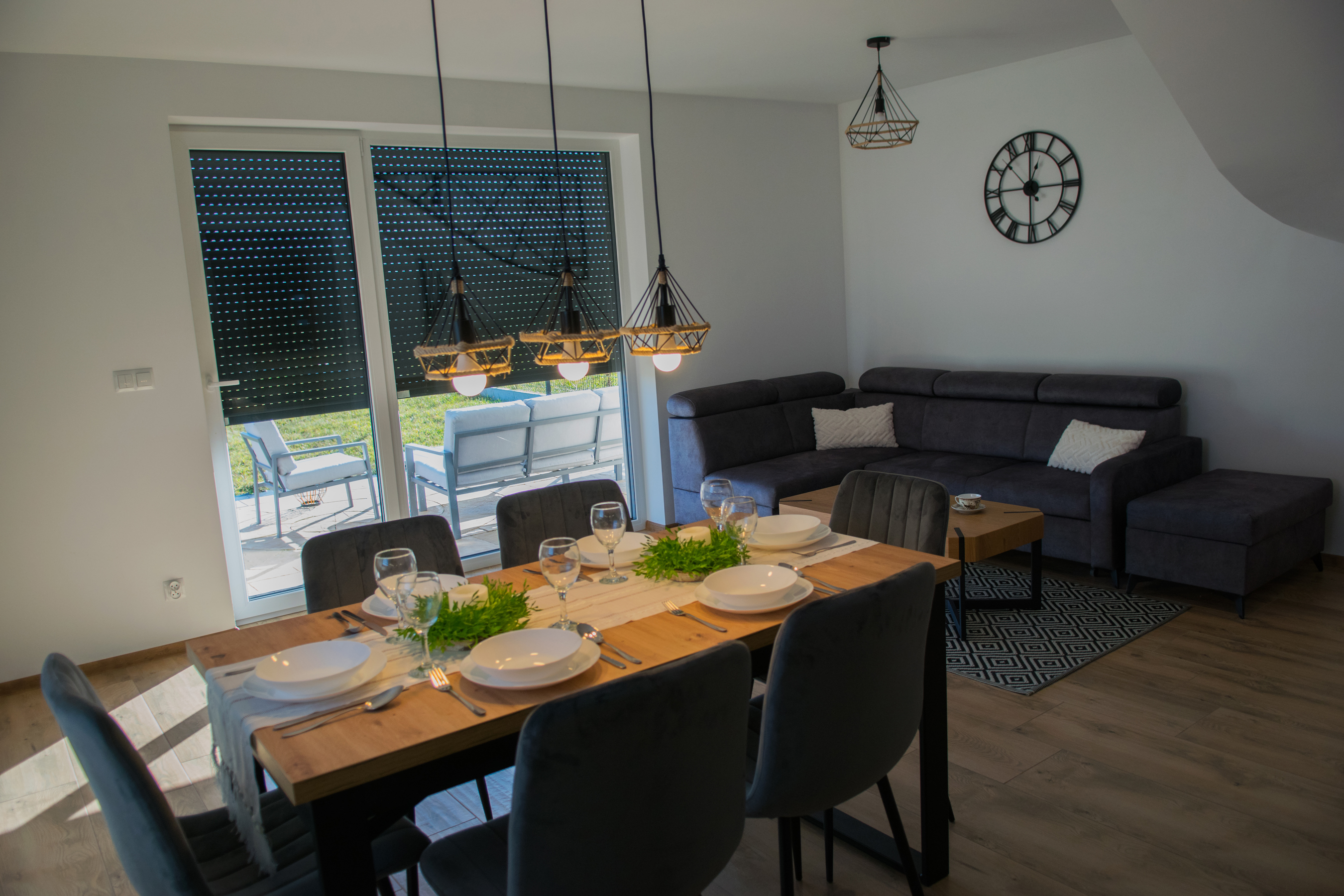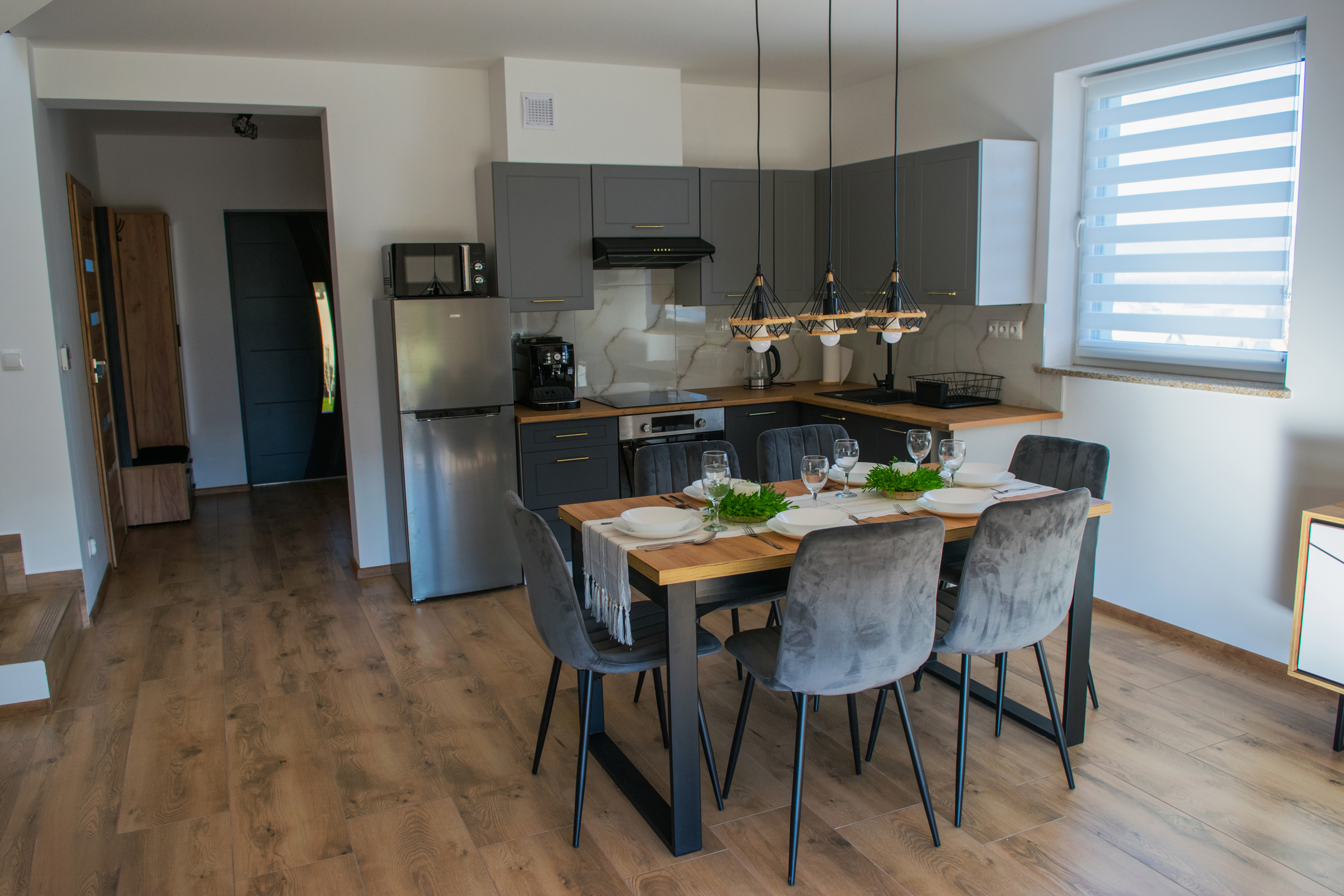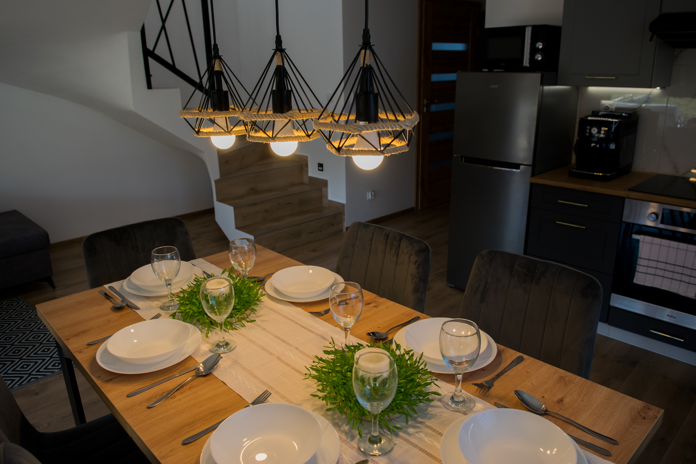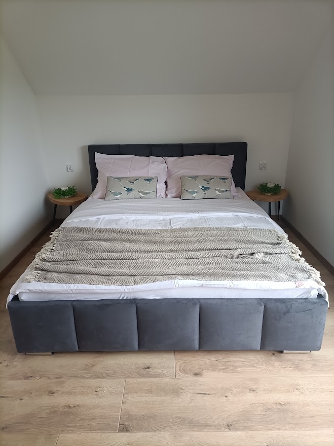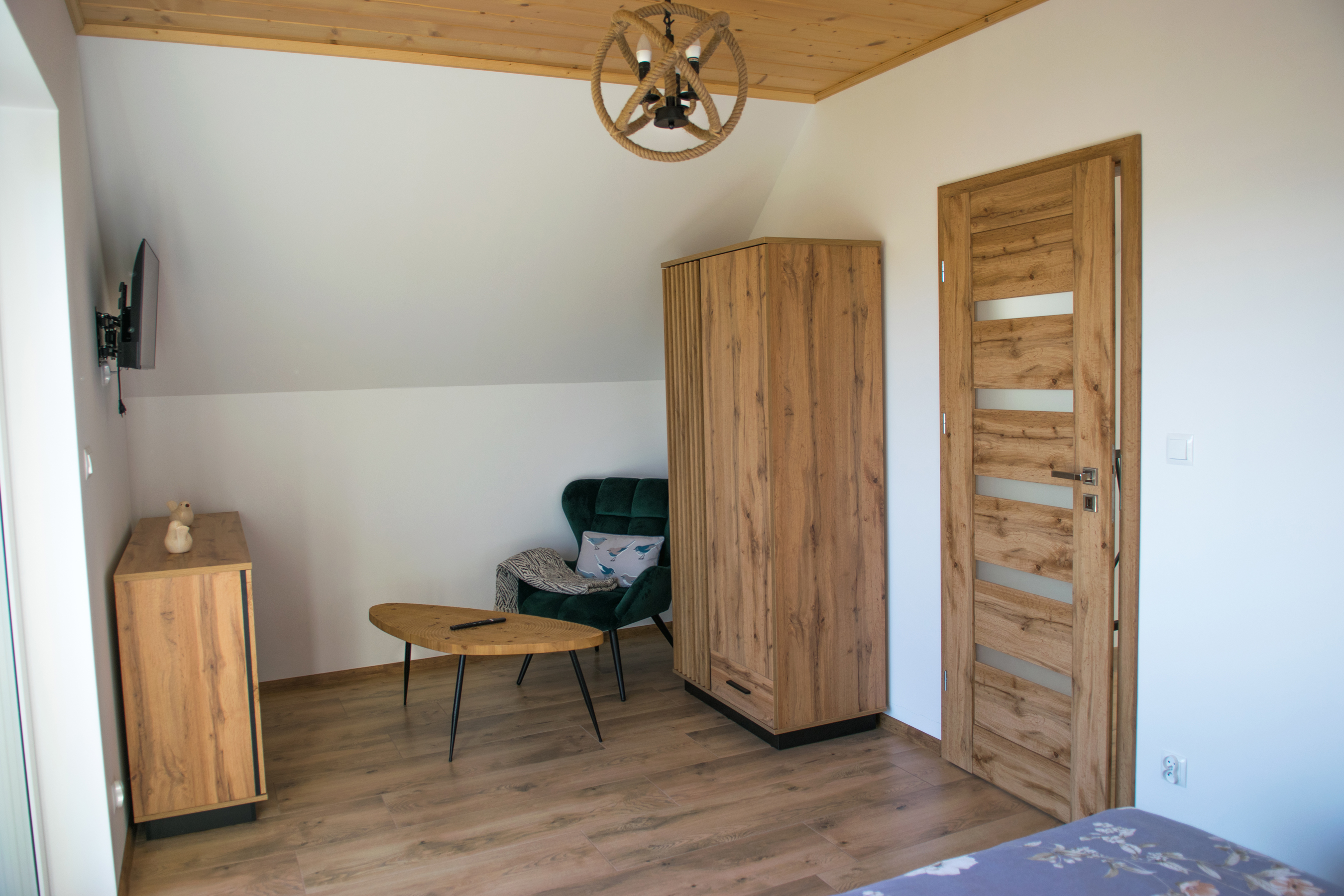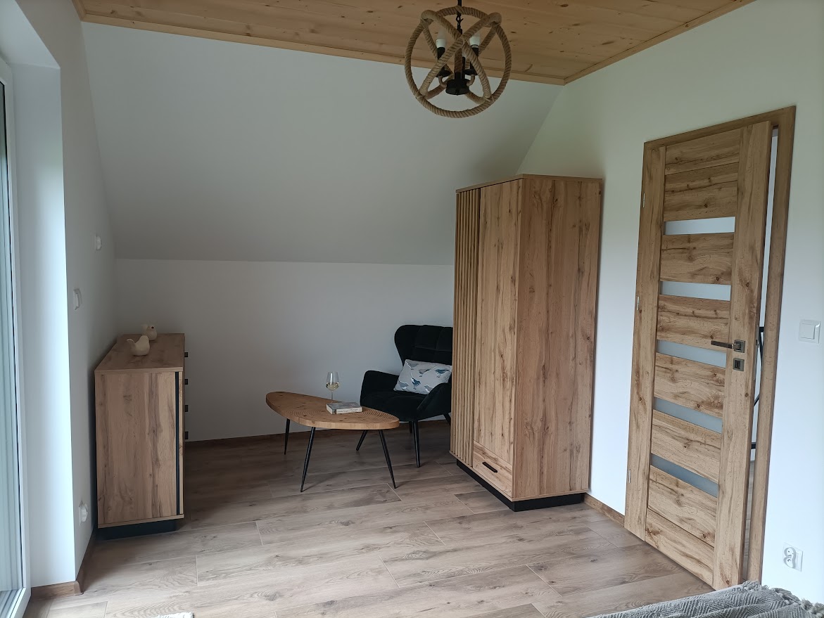 Obiekt mieści od 6 do 8 osób. Sześć osób pomieszczą pokoje na poddaszu i dwie osoby w salonie na kanapie. Jest możliwośc dostawienia łóżeczka dla dziecka. Parter posiada w pełni wyposażony aneks kuchenny (płyta indukcyjna, mikrofalówka, toster, opiekacz, zmywarka, lodówka z zamrażalnikiem, ekspres do kawy, talerze, garnki, sztućce, kieliszki, szklanki oraz kubki) z jadalnią, część gościnną z TV oraz łazienkę. Na poddaszu znajdują się trzy sypialnie oraz toaleta. W każdej sypialni są łóżka dwuosobowe. Dostęp do internetu WiFI. Każdy pokój jest wyposażony w łóżko, szafkę koło łóżka, lampkę nocną. Pokoje na górze mają wspólną łazienkę.