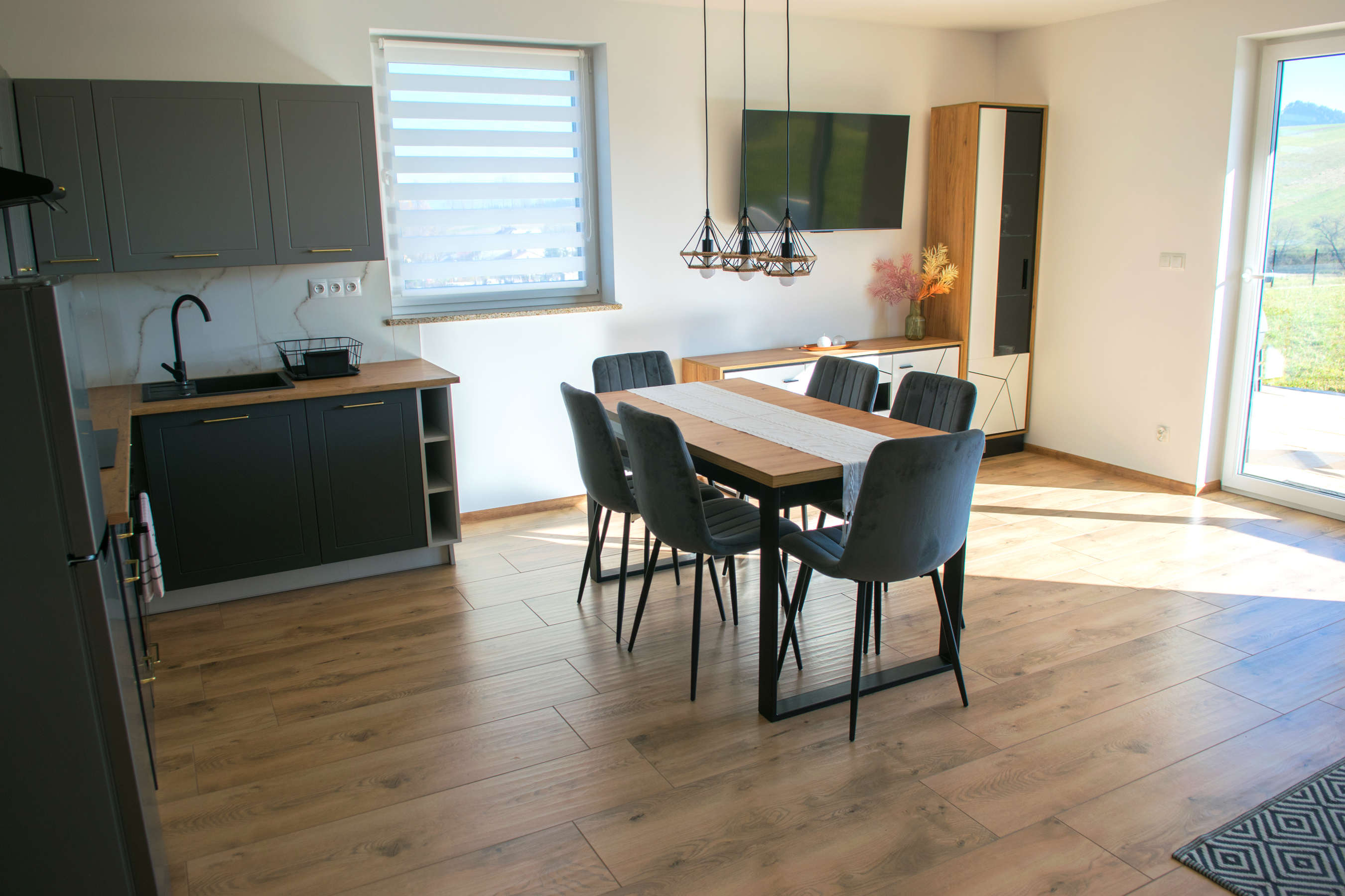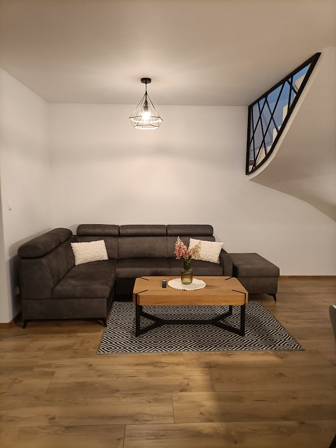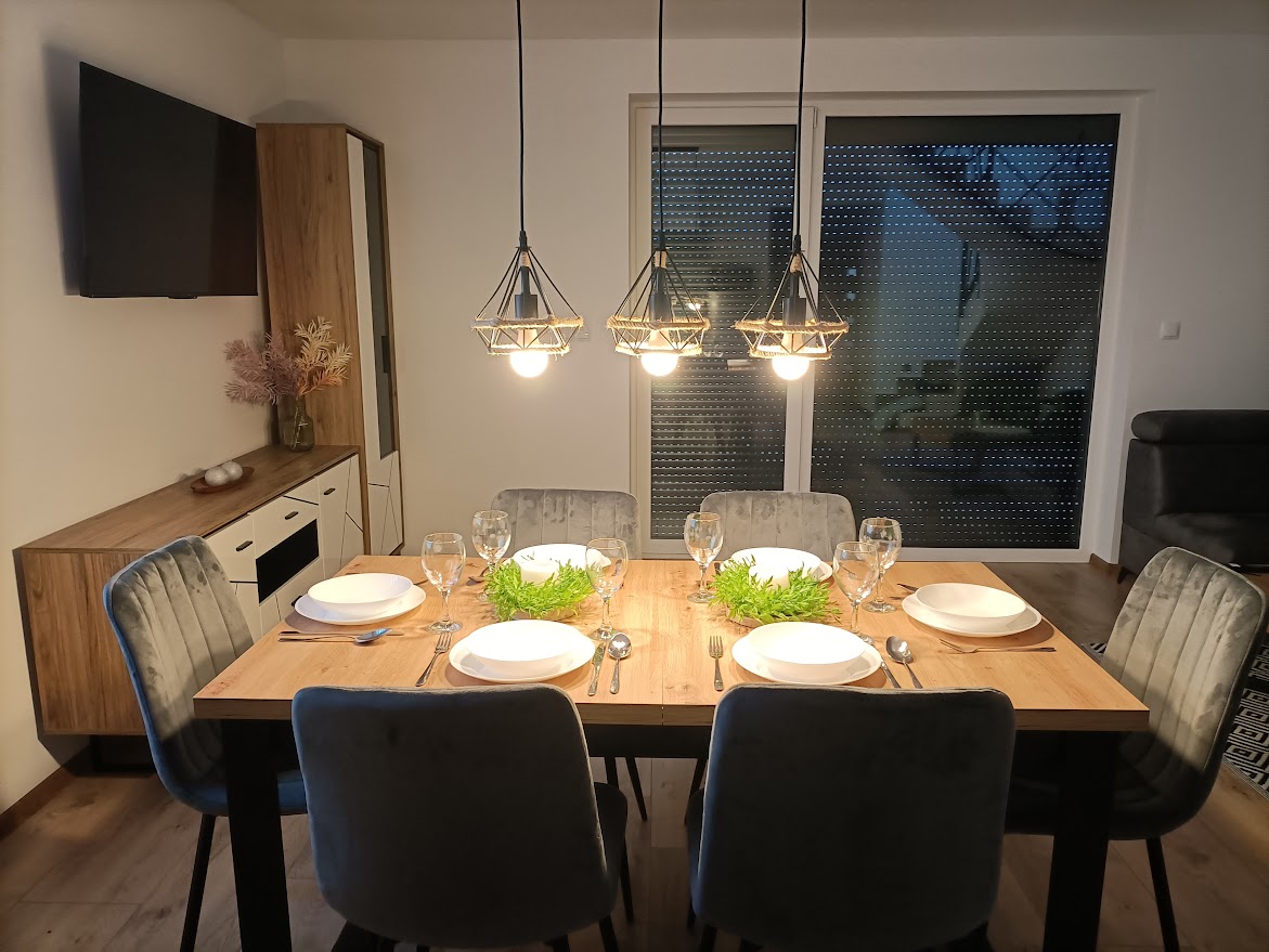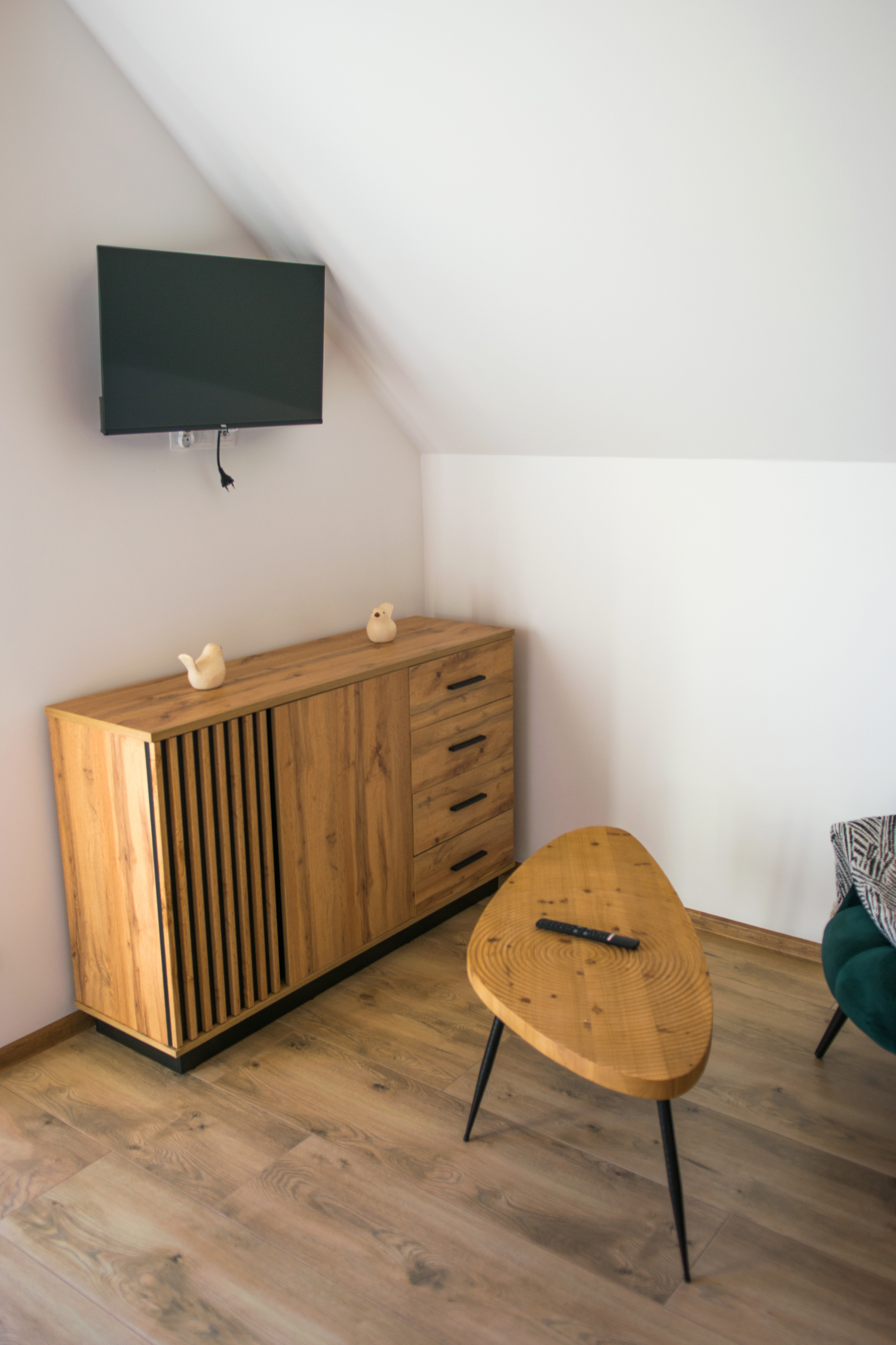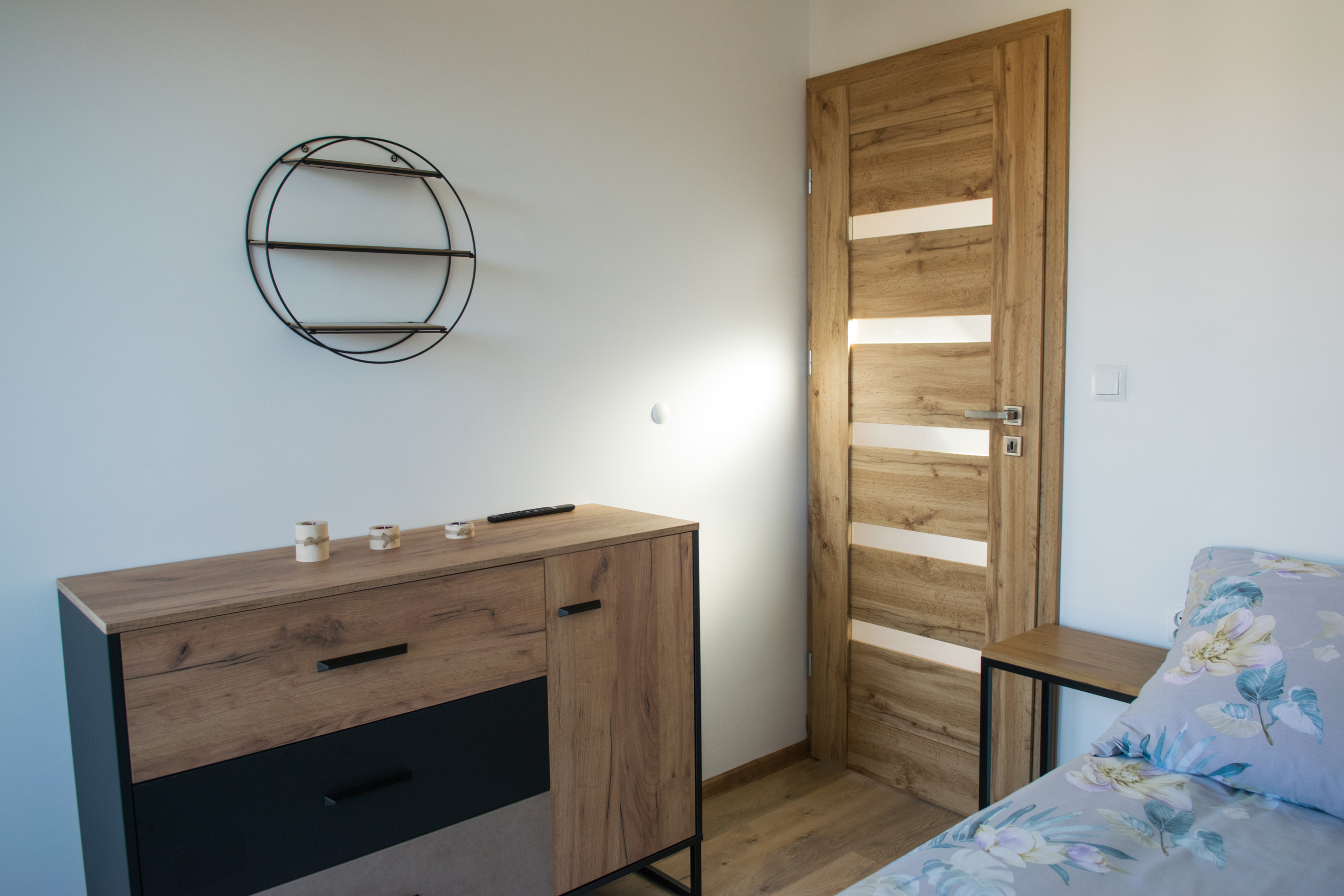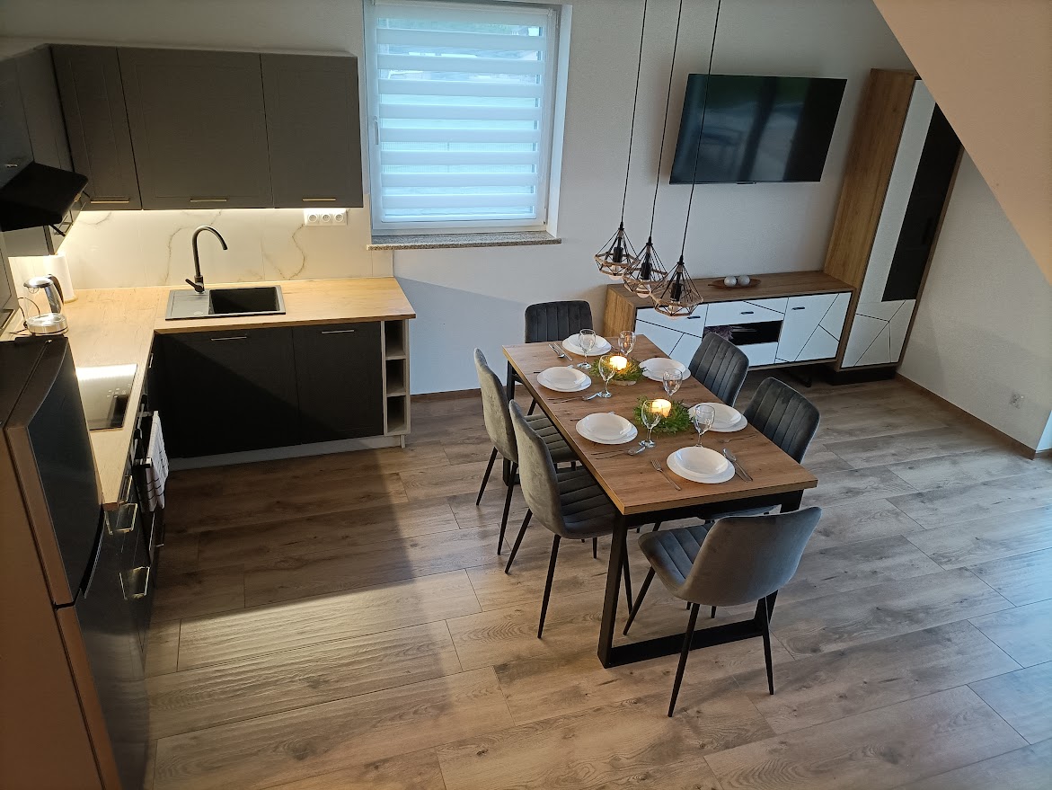 Obiekt mieści od 6 do 8 osób. Sześć osób pomieszczą pokoje na poddaszu i dwie osoby w salonie na kanapie. Jest możliwośc dostawienia łóżeczka dla dziecka. Parter posiada w pełni wyposażony aneks kuchenny (płyta indukcyjna, mikrofalówka, toster, opiekacz, zmywarka, lodówka z zamrażalnikiem, ekspres do kawy, talerze, garnki, sztućce, kieliszki, szklanki oraz kubki) z jadalnią, część gościnną z TV oraz łazienkę. Na poddaszu znajdują się trzy sypialnie oraz toaleta. W każdej sypialni są łóżka dwuosobowe. Dostęp do internetu WiFI. Każdy pokój jest wyposażony w łóżko, szafkę koło łóżka, lampkę nocną. Pokoje na górze mają wspólną łazienkę.