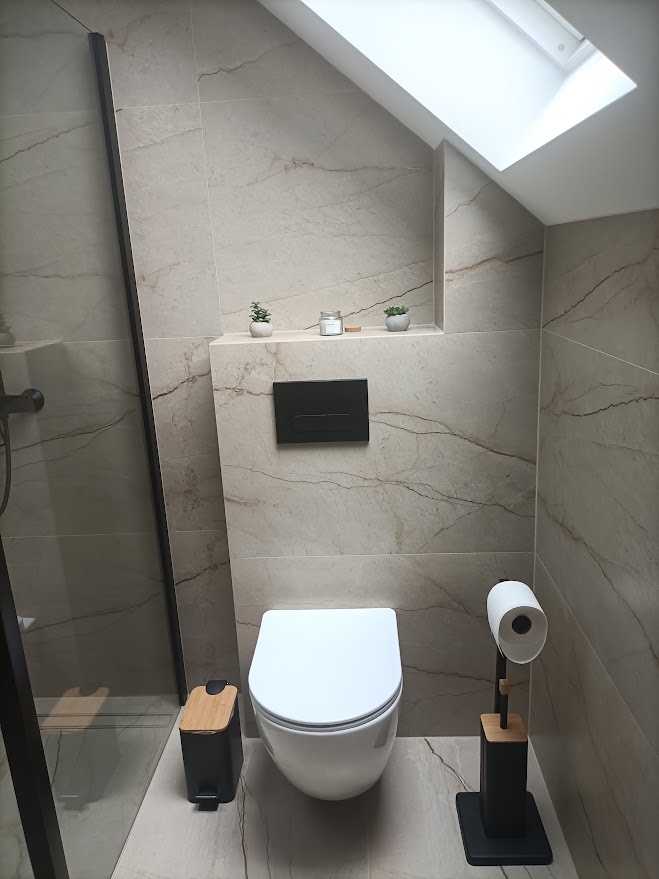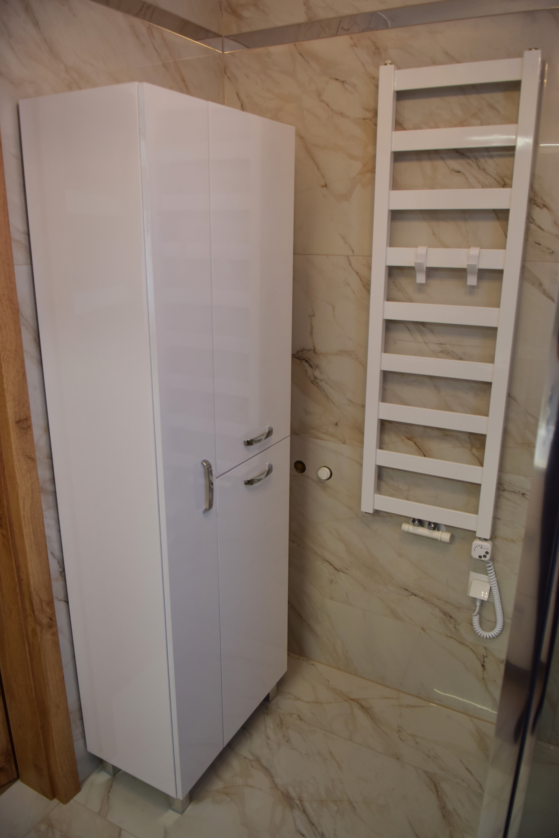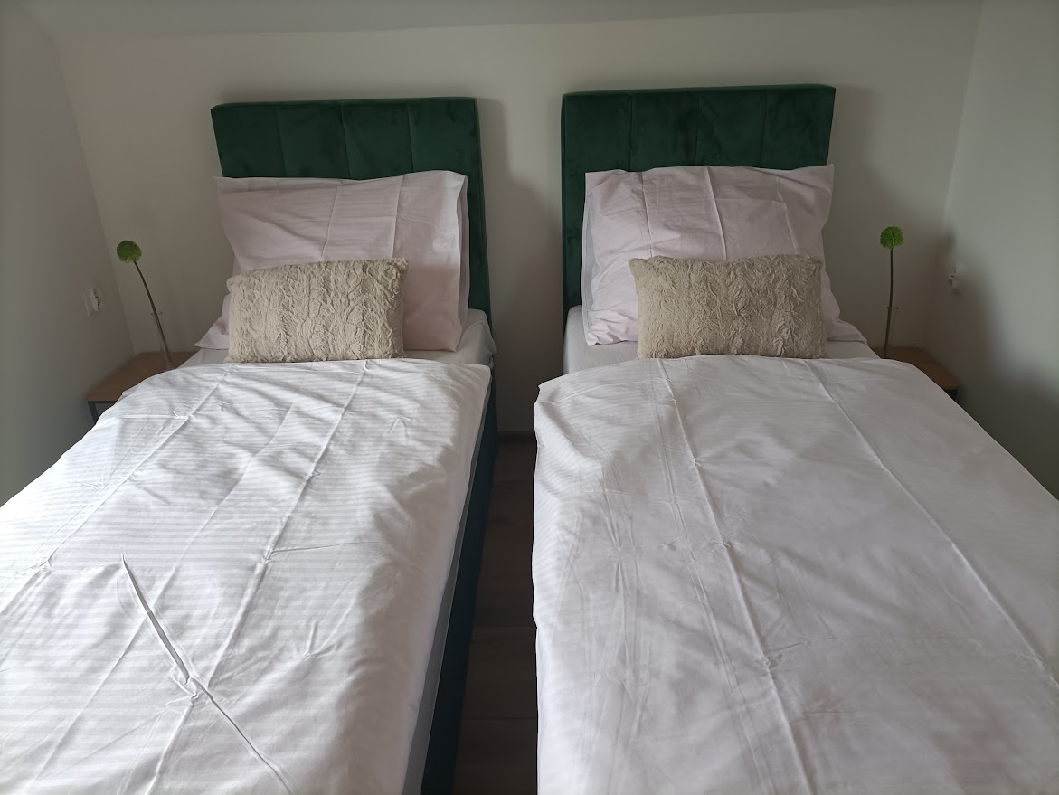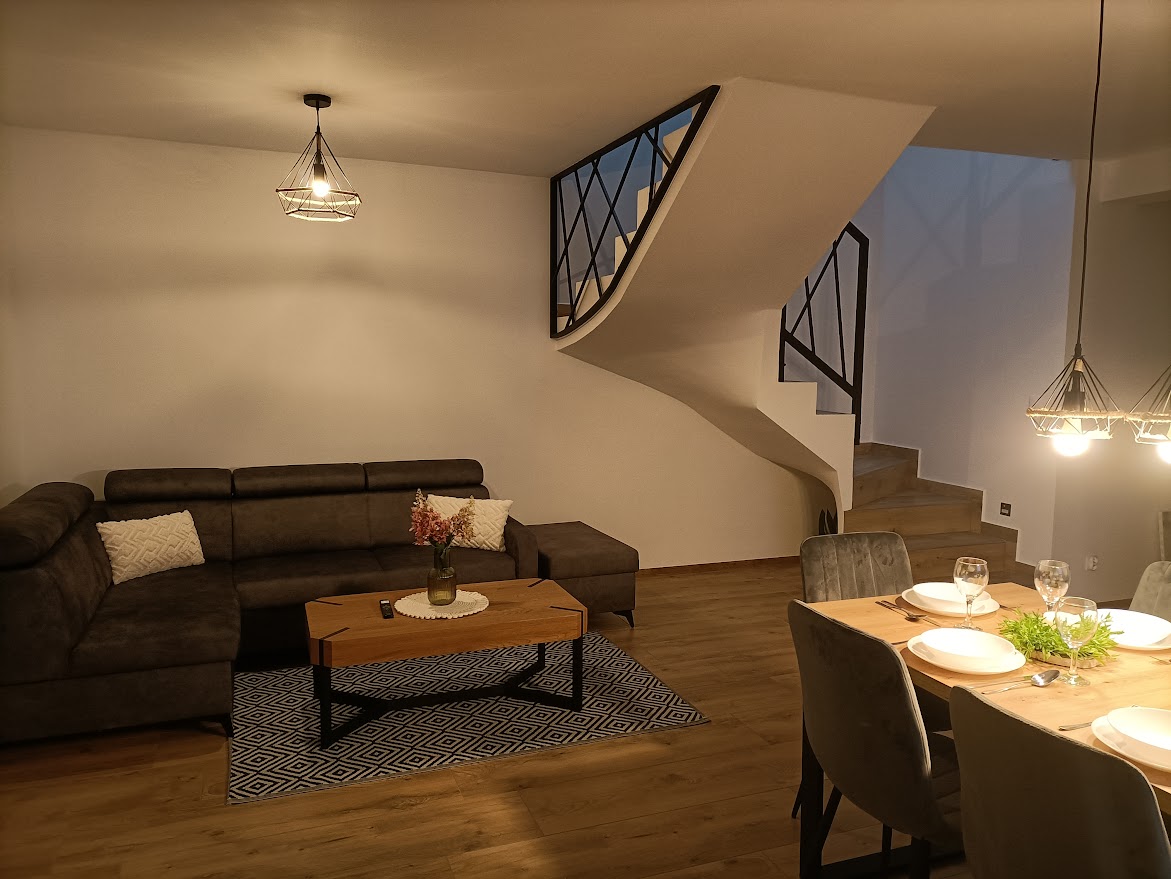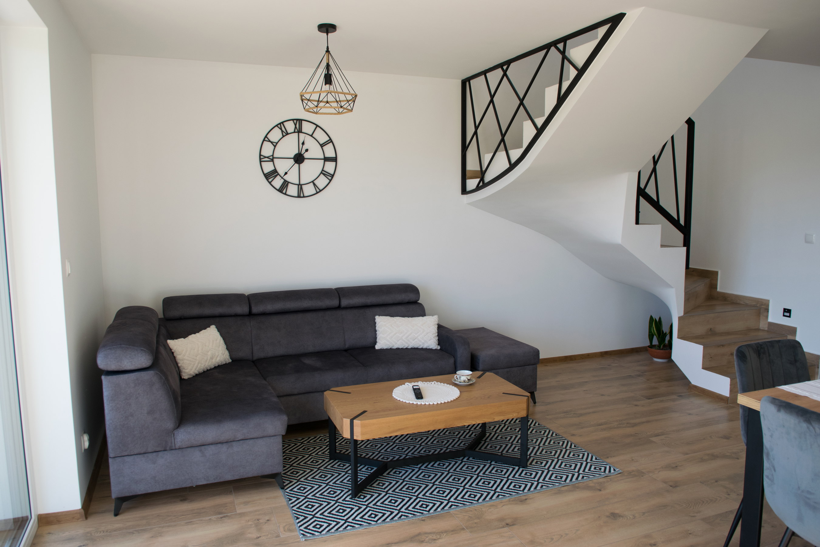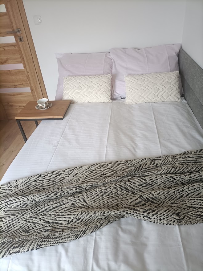 Obiekt mieści od 6 do 8 osób. Sześć osób pomieszczą pokoje na poddaszu i dwie osoby w salonie na kanapie. Jest możliwośc dostawienia łóżeczka dla dziecka. Parter posiada w pełni wyposażony aneks kuchenny (płyta indukcyjna, mikrofalówka, toster, opiekacz, zmywarka, lodówka z zamrażalnikiem, ekspres do kawy, talerze, garnki, sztućce, kieliszki, szklanki oraz kubki) z jadalnią, część gościnną z TV oraz łazienkę. Na poddaszu znajdują się trzy sypialnie oraz toaleta. W każdej sypialni są łóżka dwuosobowe. Dostęp do internetu WiFI. Każdy pokój jest wyposażony w łóżko, szafkę koło łóżka, lampkę nocną. Pokoje na górze mają wspólną łazienkę.