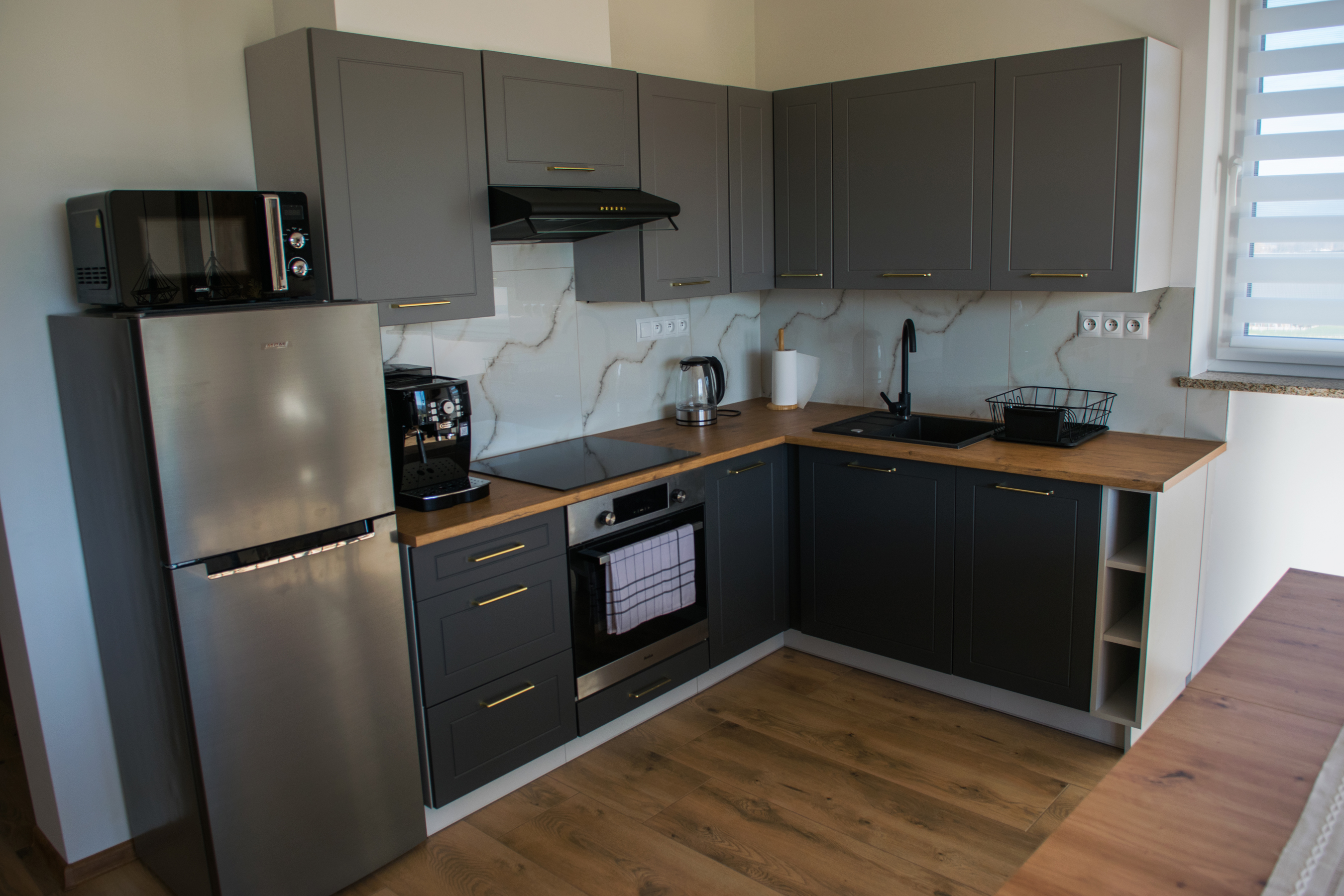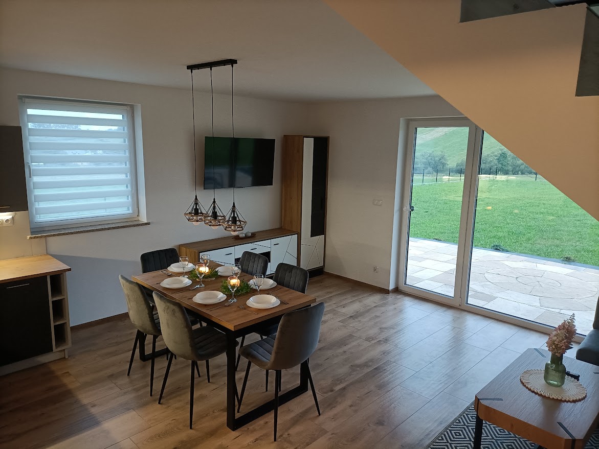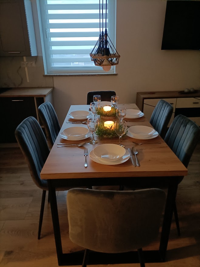 Nasz obiekt jest wyposażony w kuchnie z jadalnią, na zewnątrz dostępny jest plac zabaw z domkiem dla dzieci, zjeżdzalnią oraz hustawką, taras oraz grill.